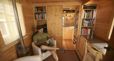 “It’s very un-American in the sense that living small means consuming less,” said Jay Shafer, 46, co-founder of the Small House Society, sitting on the porch of his wooden cabin in California wine country. “Living in a small house like this really entails knowing what you need to be happy and getting rid of everything else.”